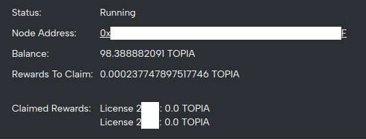 **Please note that if you do not fund your node address with TOPIA to cover gas fees, you will NOT receive any rewards.  Make sure this address has funds to cover gas for your rewards.**